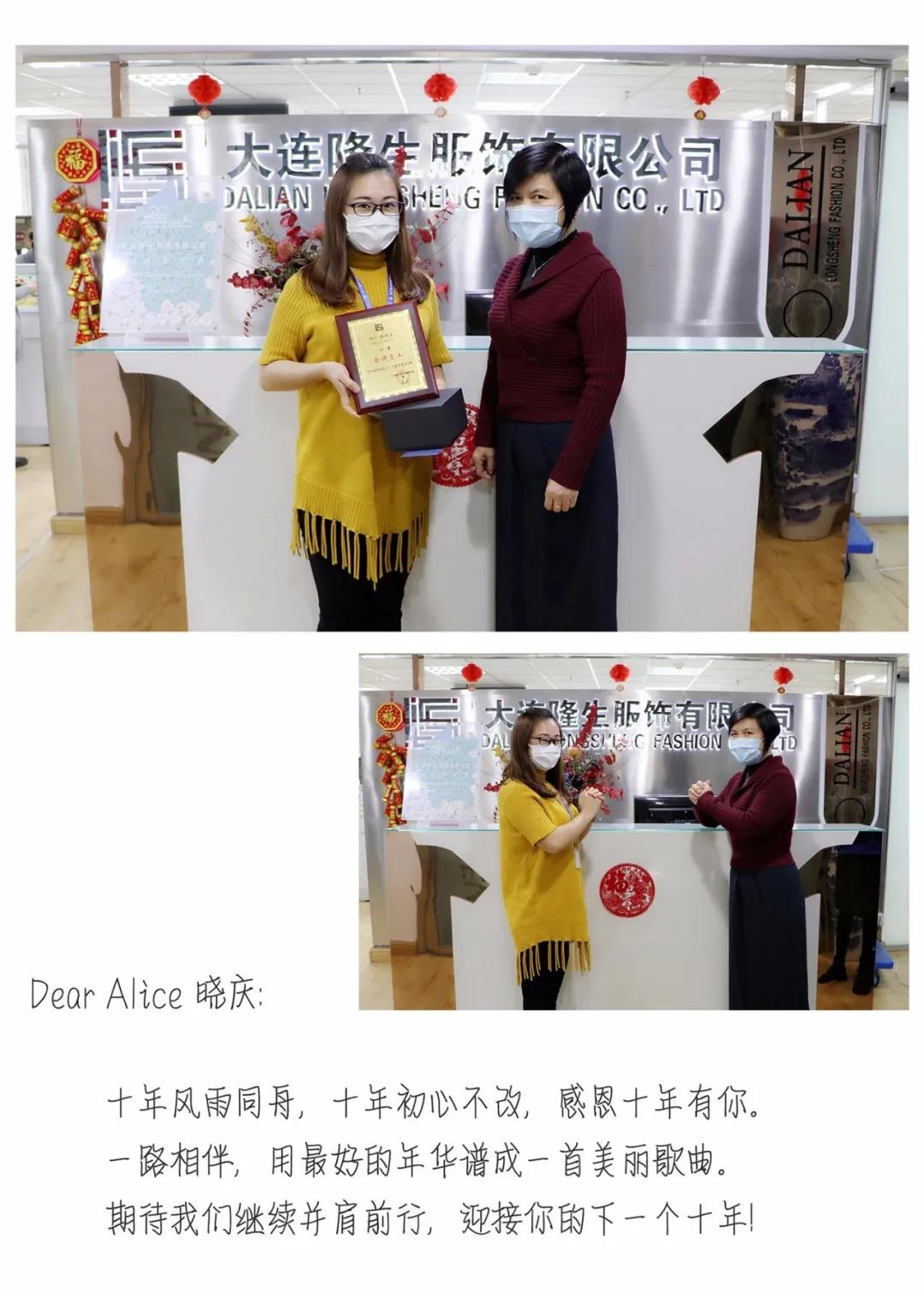 今天,吳總和HR總監(jiān)張昕經(jīng)理代表公司,共同為幾位跨入20/15/10周年俱樂(lè)部的“巾幗英雄”頒發(fā)了紀(jì)念獎(jiǎng)。禮不輕,情更重,隆生隔絕疫情,不隔絕愛(ài)!