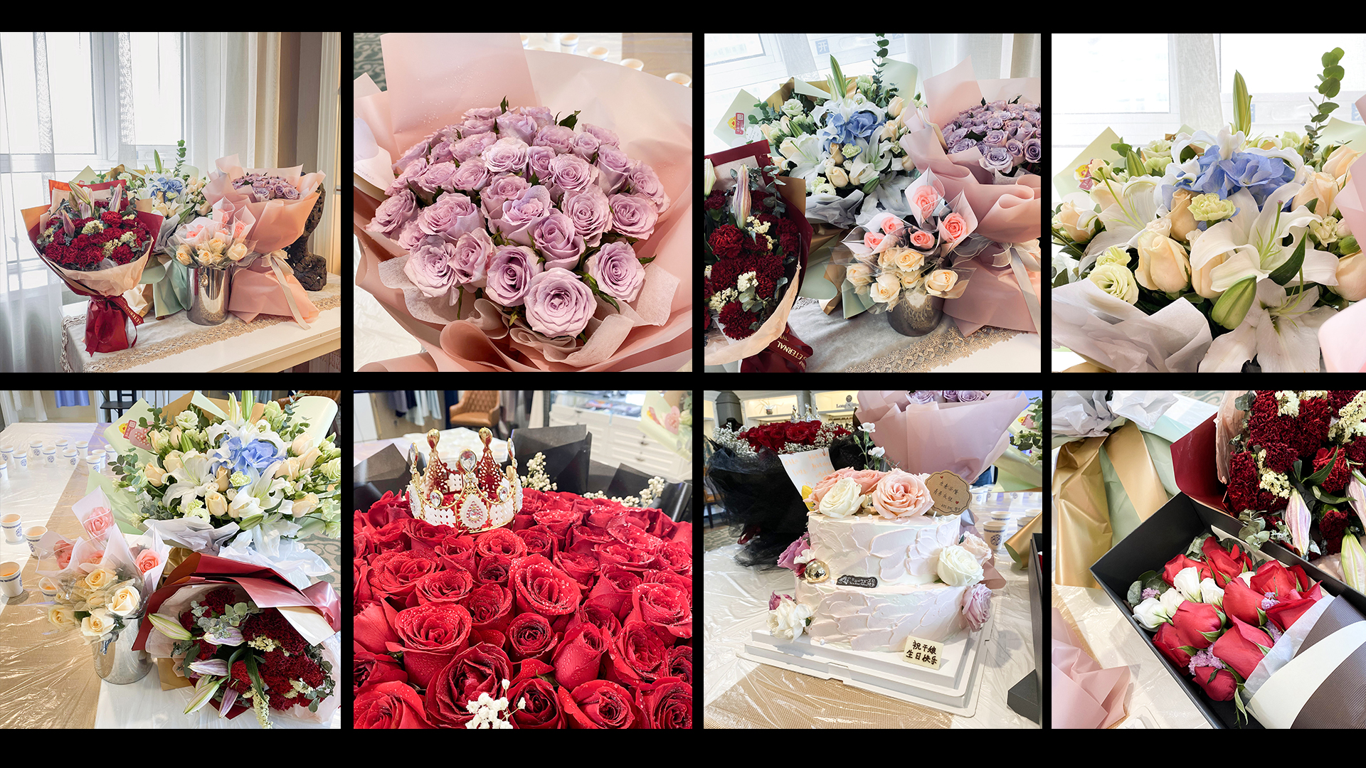 “領(lǐng)導(dǎo)生日快樂~”“吳總生日快樂~”一聲聲祝福從十六樓電梯打開瞬間開始送上五朵粉玫瑰七朵香檳玫瑰一支支隨著同事的祝福聲送入?yún)强偸种?/strong>是久違的熱鬧啊再次匯聚在公司十六樓的會所中。